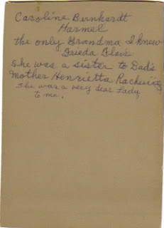 Pat Walker sent me this picture of Henrietta Bernhardt Rachuig's sister. The notation on the back was written by Caroline's great-niece (Pat's aunt), Frieda Rachuig Flair. As she says, she didn't know her grandmother Henrietta, so she fondly remembers her great-aunt as a 'substitute.'